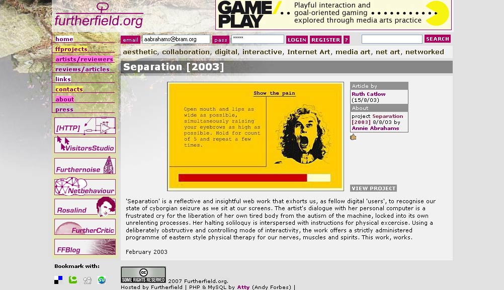 "This is the first time that my body has been directly addressed, indeed disciplined, by a Net Art work. This is made possible by its complex composition. separation/séparation is made of many parts: a web interface, an economical visual aesthetic, texts (the monologue, the instructions, the commands), human-to-machine interaction." Essay for the catalogue of "If not you not me" exhibition of work by Annie Abrahams at HTTP gallery in London, Ruth Catlow, January 2010 http://www.furtherfield.org/displayreview.php?review_id=378 |