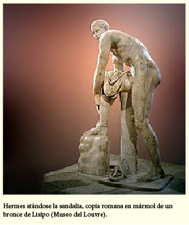 Hermes atándose la sandalia, copia romana en mármol de un bronce de Lisipo (Museo del Louvre). El rasgo principal en las tradiciones sobre Hermes consiste en su papel de heraldo de los dioses, puesto éste en el que aparece incluso en los poemas homéricos, compartiendo esta función con Iris. Un intérprete que cruza las fronteras con extraños es un hermeneus (έρμενευς). De Hermes procede la palabra «hermenéutica» para el arte de interpretar los significados ocultos. En griego un hallazgo afortunado era un hermaion (έρμαιον).