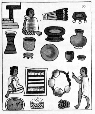 | At Market Thus were things bought, or sold: they arranged them in order so that each thing sold would be placed separately--in its own place or station. They were not spread about in confusion. Separate were those who sold chocolate, aromatic herbs, and vanilla. Apart were those who sold great capes, costly capes, embroidered capes, costly breech clouts, embroidered skirts and shifts... And also there were proprietors who were spreading out smoking tubes, pipes, and cigars, quite resinous and aromatic; and tobacco bowls; and large pottery braziers and hearths, and earthen basins, and pots, and jars for storing water, and settling jars, and flat cooking plates, and sauce vessels, and earthen cups, and everything earthenware.
