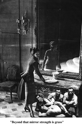 because I sought out none But took what came to me All by the magic drawn. I had sweet company I had no dark friends but one." This poem by A.E. Housman forms the title of Adam's collage, "I Had Sweet Company / because I sought out none." This collage depicts a woman who is so esthetically entranced by the physical attention she is getting from her slimy soul mates, who is so resigned to their special love, that she is far beyond male desire. Her stereotypical beauty only accentuates her alien nature. Adam has converted a model in love with jewelry into a the dreaded Lady Arabella, whose crimes against humankind are too atrocious to mention. | ||