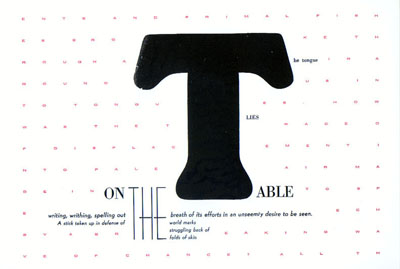 ![]() "Writing is a visual medium" -- Johanna Drucker ![]() Figuring the Word: Essays on Books, Writing, and Visual Poetics by Johnna Drucker is available from Granary Books ![]() All images link to larger, more detailed picture files. ![]() |