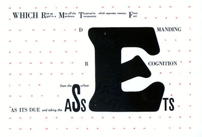 If Burger's theses of the avant-garde as questioning institution and questioning medium are to be taken for granted, then Drucker certainly fulfills expectations, and shows that the avant-garde did not die with high modernism, and can remain political. Drucker destroys any institutionalization of the routine mechanization of book production. And she tortures the very routine incarnation of the word, both paradigmatic and syntagmatic, both in appearance and in linearity. "Attention to the stuff in the medium is not the fetishization of some theory based supplement, but recognition of the fact of the matter," she writes in "Linguistic Authority and the Visual Text;" "Authority is construed to reside within power and that power in the gross concealment of its means. The laying bare of devices so dear to our forbearers was a means of deconstructing that very authority." These words are not written linearly, nor in the same font size, and show the functioning of Foucauldian micropower in language. The imaginary materiality of language is emphasized to defeat logocentrism and demystify ideology. The text opposes itself: art as anti-art. It is only natural that the twentieth century should turn to the material inscriber itself as part of its avant-garde project, given the discovery of language, and consciousness of visual culture. Take The Word Made Flesh, in which each page contains a letter which later becomes manifest as an acrostic text of the larger book. That this should manifest itself in the book form in which it does in Drucker is the result of larger social and economic forces compelling the book as focus to the foreground. Drucker's work is somewhat anarchic as it is feminist, showing that the phrase postmodern avant-garde genre, an avant-garde that is political, is not oxymoronic. ![]() But Drucker, ever in step with the times, is now ready to move beyond the book, into cyber-space, and is currently working on a hypertext at www.VisCult.com. Drucker meditates considerably on the differences between the printed and the electronic text. "The [electronic] 'forms' which will emerge won't, I don't think, replace print media for a long time we're too attached to the intimacy and convenience of portable books and magazines," she suggests in an interview, focusing on the privacy of the bourgeois sphere that Benjamin dissects in his Arcades Project and on which Watt focuses in his Rise of the Novel (Indeed, this raises interesting genre questions: though read as a "poet," Drucker sees herself as a prose writer. This is not merely the issue of prose poetry, but rather one of cultural spherification versus essentialism, which is not to argue for an essentialist generic reading of Drucker, but rather for a generic reading). "I see hypermedia in terms of continuities and disruptions" she states, seeing both similarities and differences with the book, similar ways of exploiting fonts, different temporal experiences for instance. Clearly Drucker's electronic work will have continuities and disruptions with and from her earlier work: we will see the same stylization of the material, but in an entirely different setting. Ramez Qureshi resides in Scarsdale, NY with his cat. He has degrees from The University of Pennsylvania and Bath Spa University College. He has published poetry and criticism in Read Me, Jacket, Rhizome, Lynx, and Cauldron & Net. | ||