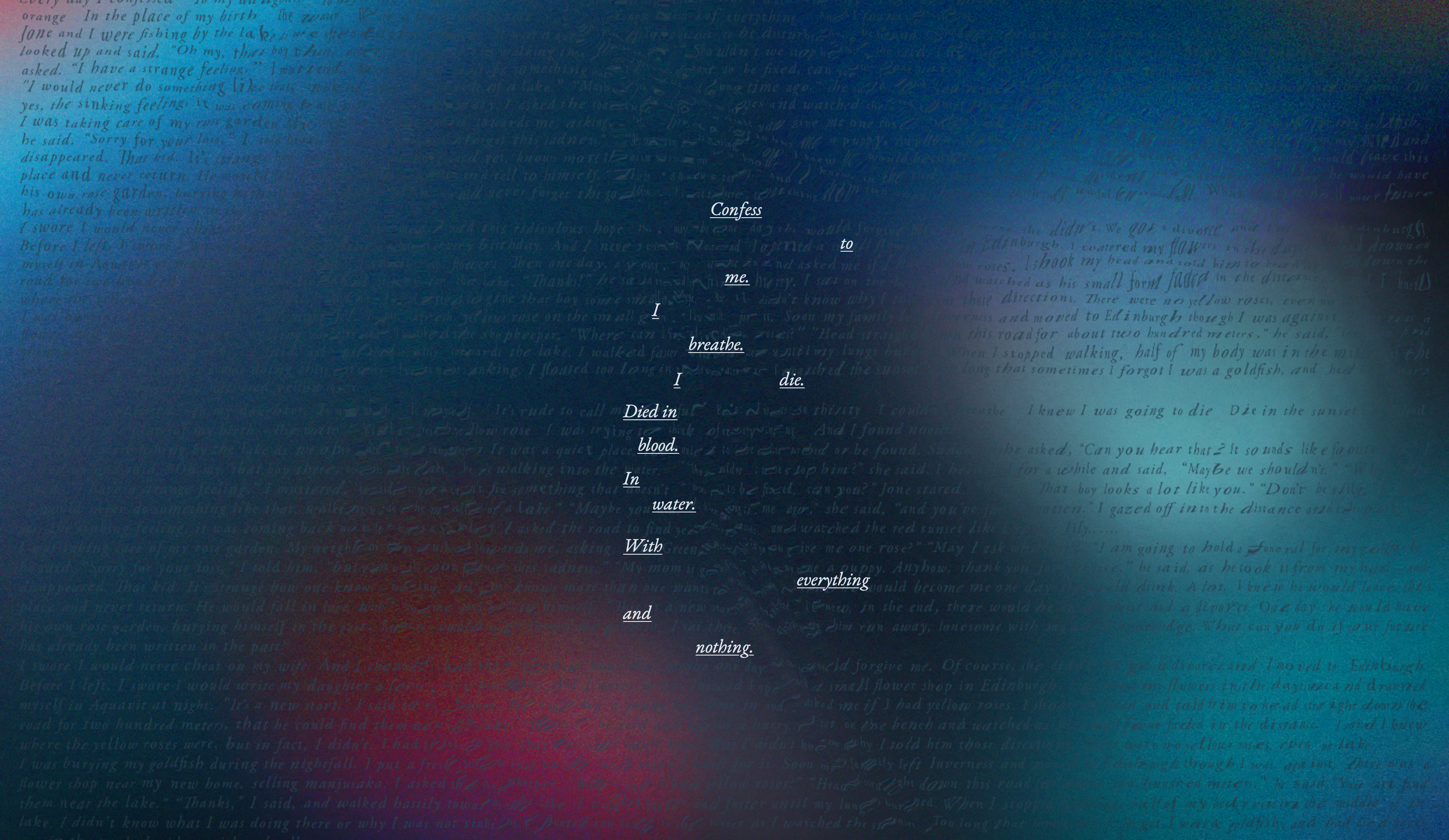 The story applies several narrative strategies, including maze narrative, circular method, and leaping strategy. The author designs the surreal plot with entangled interlinks on purpose. One more layer is set in the digital form with interaction, creating the atmosphere and revealing the underlying implication. The interface utilizes codes for interaction and a shader based on a jQuery Ripples plugin to create the water wave effect. The author tries to break the limitation of the online reading experience by creating the bridge between vision and tactile sense. The water wave also has multiple meanings as a vital sign of the intervening substance for the circle of life.