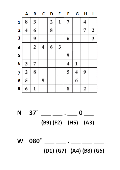 "Wingdings, Wallace, wingdings?!" you shout into the phone as soon as he picks up. "Whoa, calm down, usually you appreciate puzzles. I mean, you're practically addicted to cryptograms." "Yeah, I know. Look, Wallace, this is serious. I need that container back." "You are being so weird today. You were just begging me to get rid of it for you." "Oh, PLEASE tell me that you didn't throw it out or something. Did you lose it??" "No, no. Calm down. I hid it. I didn't know what it was. I thought maybe it was drugs or something." "No, Wallace, it's not drugs. It's my eyes." "Your eyes?" "I really don't want to explain. Can you just bring the tupperware back?" "Sorry, no, I really can't. I just started my shift at work, and I already took a break to answer your call. I can't get it until after I get off." "I really can't wait that long, Wallace. Can you tell me where it is?" "I went for a walk through the woods killing time before work since you didn't want to hang out. I hid it in the hole at the base of a big tree with yellow tape and put a couple of rocks in front of it." "Which woods? Which tree?" "I have the coordinates written down. I sat down, figured them out, then had some fun. I thought maybe I'd want to find the container again later." "Well, I do want to find it. Can you tell me the coordinates?" "I'll send them to you from my Droid. Just don't be pissed at me, O.K.?" Wallace hangs up the phone before giving you a chance to respond. What did he mean by that? Your phone beeps with a new email, and when you open it you understand his comment immediately - in order to figure out the coordinates, you need to solve a sudoku. You're annoyed, surely, but not surprised - you did meet Wallace at a puzzle lovers convention, after all. Desperate, you try to channel your nervous energy into solving the puzzle as fast as you can - you'll have to go find that container!
