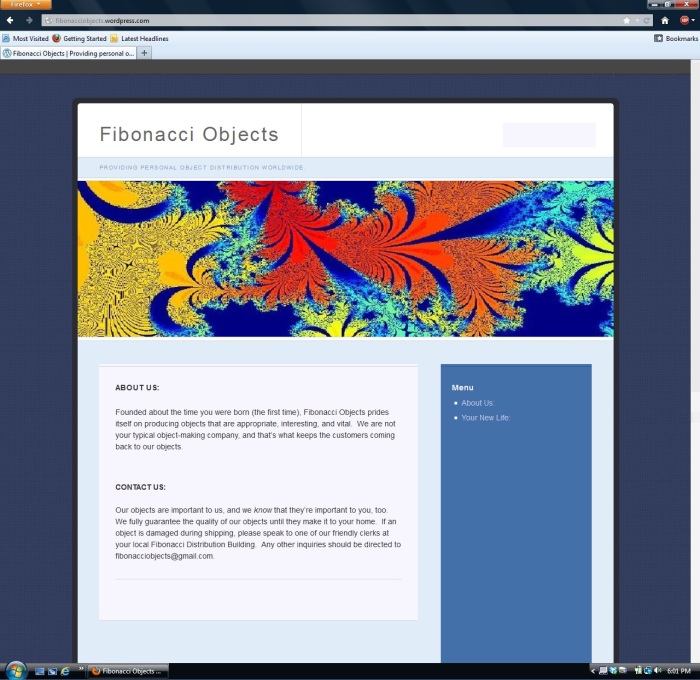 You return to your house, cylinder in hand. You feel a little bit silly about the whole thing - both feeling the need to toss the object away and being convinced to retrieve it just based on the emails you received. You do wonder how the Fibonacci folks knew who you were and where your object had fallen... Oh well, you've always liked a good mystery, right? The best way to show up Aunt Mareen is to take a strong, logical hold of your sanity. Thus, you decide to return to that website, see if you can figure anything else out. You left the page up on your computer, so you sit down, move the mouse around to dismiss the screensaver, and take a look at the Fibonacci Objects website again. Yep, everything looks the same. Wait - hold on a minute - you swear that you notice something new on the screen. What happens if you click on it?
