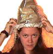 Laughs. Wearing nothing but her tall medieval hat, Joan scrambles up the carpeted stairs and slides
