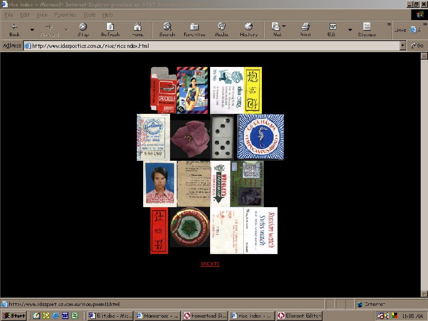![]() ![]() Cumulatively, the experience of navigating and attempting to comprehend "rice" parallels geniwate's creative struggle to capture or accurately portray Vietnam, hindered by the consciousness of her status as stranger and tourist; she appears to have visited the country in an artistic and investigative capacity, but found herself hard-pressed to reconcile Western values and beliefs with the widespread poverty, oppression and filth she observed, along with the country's ingrained history of despair (with the Vietnam War as an obvious locus). This feeling of incomprehensibility is effectively transmitted to us in the form of fuzzy or small, partial images in which the text is often tantalizingly unreadable, or simply in another language (deliberately lacking "user-friendly" translation), turned on its side, and so forth. Spoken words and recorded sounds often seem distorted or garbled. At the same time, each object and its related commentary serves as an indictment of Western involvement in the region and capitalism as a whole—in one "room," the background is wallpapered with various shades of the line "Vietnam is working for you," suggesting sweatshop exploitation and recent Third World manufacturing scandals as well as Marx's unseen labor working to supply the voracious demand of ideologically brainwashed consumers elsewhere in the world. In another section (top row, leftmost tile), geniwate comments ironically on the nature of the Web itself—we are fed a series of impressions of Vietnam we initially believe to be authentic, only to discover that geniwate plagiarized each vignette from Internet sources before even setting foot in Vietnam. In her own words:    The previous things never happened to me Though the text resembles casual prose, the words have the nuanced pacing of poetry—one doubts that the line-breaks are completely arbitrary, as would be the case with automatic text wrapping. Instead, there is a deliberate tempo and separation between words that places emphasis on certain terms, e.g. "poems," "nothing," "something." The financial language—"acquired," "efficient," "outlay," "bought," "booty," and "shopping"—draws attention to our capitalistic baggage and in effect juxtaposes the artist's process of garnering ideas and inspiration from foreign soil with more hostile forms of economic takeover and appropriation. Hence, geniwate the artist prowls for "conceptual booty" while geniwate the tourist anticipates more material purchases. Metaphorically, the project's title itself invites interrogation—rice as a structural principle conjures intriguing possibilities: the particular (grain-level) and the whole; abundance; uniformity; even a quality of random sampling that, once repeated often enough, leads to a greater overall understanding. It is also worth noting that rice, as a staple of the Asian diet and one of the stereotypical representations of Eastern living, connotes difference. It also represented a key factor in Vietnam's value to competing colonial influences earlier in the century—a University of California, Santa Barbara, Web site devoted to Vietnam/Indochina's economic "significance" during and following WW II argues that what made Vietnam "such a critical international policy issue" was, primarily, food: As one of three East Asian rice exporters (along with Thailand and Burma), Vietnam had the capacity to feed millions beyond its own population. Through its export of more than 1,725,000 metric tons of rice in 1936 alone, Vietnam supplied the rice eating regions under French control with a staple the empire could not have otherwise provided. Thus, early on it was Vietnam's agricultural potential that was seen as the reason why French or Chinese interests would want to "acquire" Indochina for themselves. The concept of frames offers another valuable structural metaphor with which to approach "rice"'s construction and consequent meaning, again in terms of a framework of understanding, particularly "Western" conceptions of the "East." For instance, on the main index page, a highly stylized poster of a glamorous female bathing suit model or actress stands in apparent contrast to the passport-photo-like picture of an androgynous Vietnamese woman, hair cut quite short, wearing a serious expression—Hollywood-inspired ideal versus plain and somber reality. Aside from the background grid discussed earlier, frames also double as interpretative barriers and delimiters, in the form of a TV screen in poem8, the walls of a hotel room in frame12, camera stills in poem14, and so on, all to some extent symbolic of imprisonment and claustrophobia. As "users" of this electronic work, we share this sensation; in our movements we are allowed little room for experimentation—each segment is fairly linear in structure, often requiring subsequent clicks but never any divergent options, simply backward or forward. As a whole, the piece resembles a gallery or art installation—separate rooms constituting a whole—more than a truly interactive experience. We are readers, listeners, witnesses (and therefore, we become complicit). In the absence of a plethora of critical commentary in regard to electronic literature, how do we interpret "rice" in all its complexity—a totality that incorporates elements of vocal performance, photography, and poetry in a peculiarly digital and ultimately political blend? In Issue One, Volume Two ("Women and Technology") of Riding the Meridian, geniwate herself suggests the answer, bringing together equally disparate influences in her reflections on Donna Haraway's "A Cyborg Manifesto" as well as her fondness for knitting, an apparent contrast of traditional woman's work to the often masculinized world of technology and computing. In geniwate's eyes, however, the two are not mutually exclusive—she concludes that "Western, wealthy, educated women are now in a position to knit new types of products—identities, lives, programs—and sw
