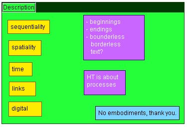 There isn't still a fixed terminology to talk about hypertext (this was suggested by some participants to be positive). Our vocabulary is "fuzzy". However, it's clear that there are different possibilities of interaction with the (hyper)text. The attendees made an effort at proposing categories to characterize perception and reading. Perception could be either linear, planear or spatial, depending on our level of engagement with the text. Here we talked a lot about Jane Douglas's paper on "Engagement, Immersion and Flow", and also about Bolter's ideas of "looking at" and "looking through" the text. Not to forget when talking about hypertext's reading processes is the dreaded phrase that kept on coming up: frustration of expectations.
